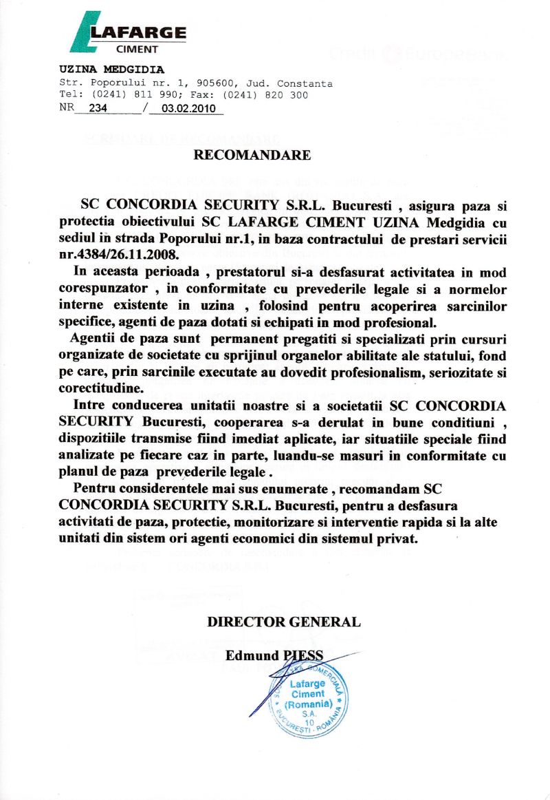 S.C. LAFARGE CIMENT (Romania) S.A. cu obiectivele Fabrica de ciment - Medgidia si cariera Tasaul, ambele in judetul Constanta.