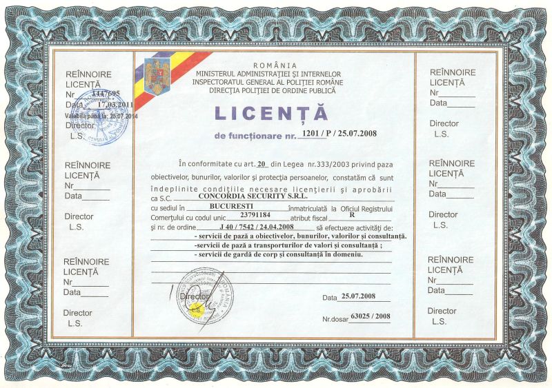 In baza Legii nr. 333 din 08 iulie 2003 privind paza obiectivelor, bunurilor, valorilor si protectiei persoanelor precum si a licentei de functionare eliberata de Inspectoratul General al Politiei Romane, S.C. CONCORDIA SECURITY S.R.L. presteaza urmatoarea gama de servicii: